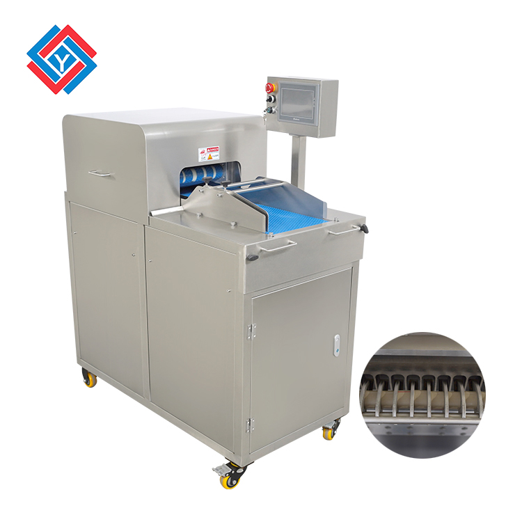 這款切肉丁機整體采用了不銹鋼制作,機身鋼板厚度達到了3mm,表面使用了拋光拉絲處理工藝,優(yōu)化衛(wèi)生方便清洗,切肉丁機的刀片是不銹鋼材質(zhì),特別淬火加工過后,可用鋒利的刀片將鮮肉開條再切塊,切割紅殺肉塊的肉丁迅速且大小均勻,機身同時還采用了快拆式刀組,方便更換加工其他肉類,省去了大量的人工成本。